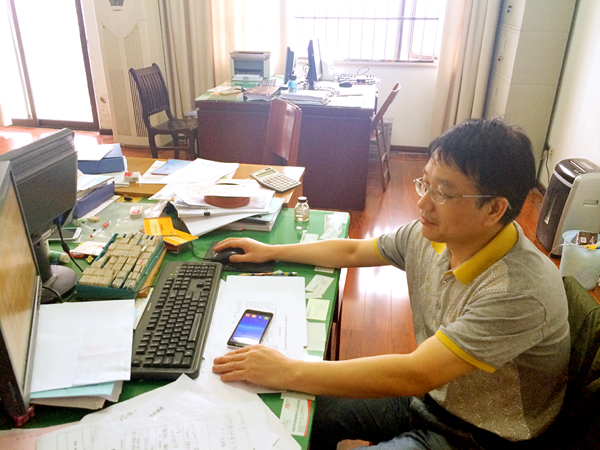 走进财务部的办公室,周家煌的办公桌上的摆设一目了然:桌面整洁干净,桌上的文件排放的整齐有序。左上角垒起来的俩堆书籍,其一是《财务会计》、《中国税务》等财务专业的杂志;另一堆书籍置于顶部的是《计算机财务管理:财务建模方法与技术》,往下的是诸如《计算机办公软件应用》、《信息时代的财务创新》等。